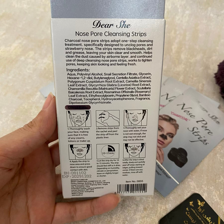 چسب بینی زغالی دیر شی، منافذ بینی و جوش های سر سیاه روی بینی را از بین می برد. این محصول منافذ پوست بینی را تمیز و برای مدت طولانی جمع میکند. این محصول به صورت پک ۱۰ عددی ارائه می شود. چسب بینی دیرشی، از زغال طبیعی چوب های جنگلی تشکیل شده است که علاوه بر اینکه در تعادل چربی، روشنی و پاکسازی عمیق پوست کاربرد دارد برای جذب سموم اضافه و جوش های سرسیاه عالیست. همچنین به دلیل وجود خاکستر آتشفشانی در این محصول برای از بین بردن سلول های مرده پوست مناسب است.